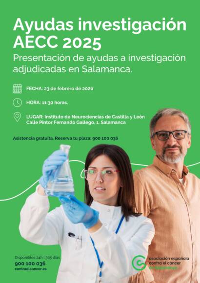 El Instituto de Neurociencias de Castilla y León acogerá el próximo 23 de febrero de 2026, a las 11:30 horas, el acto de presentación de las Ayudas a la Investigación AECC 2025, una jornada dedicada a dar a conocer los distintos programas de apoyo a la investigación impulsados por la Asociación Española Contra el Cáncer y los proyectos financiados este año en Salamanca.
