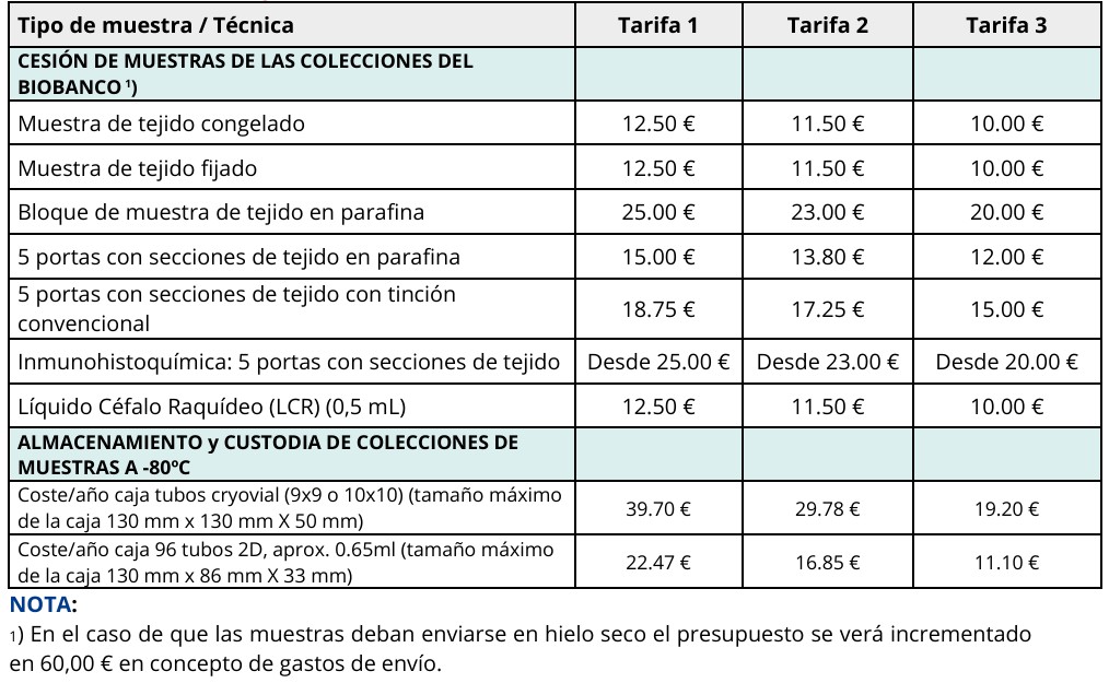 Las muestras disponibles en la Plataforma de Biobancos del IBSAL están exentas de cualquier valor comercial. No obstante, el grupo solicitante deberá sufragar los gastos de manipulación, mantenimiento y transporte de las muestras proporcionadas. De igual forma, los costes por el resto de los servicios ofrecidos corresponden únicamente a gastos de procesamiento, envío y gestión de la
