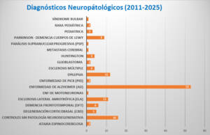 El número total de cerebros que disponemos en nuestro biobanco es de 135 y en este gráfico se muestra de forma general el número de cerebros según el diagnóstico neuropatológico realizado.