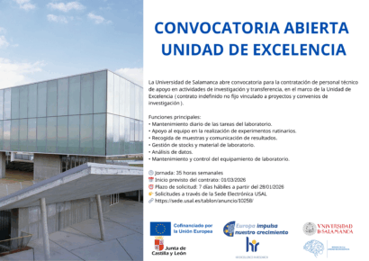 La Universidad de Salamanca abre convocatoria para la contratación de personal técnico de apoyo en actividades de investigación y transferencia, en el marco de la Unidad de Excelencia (contrato indefinido no fijo vinculado a proyectos y convenios de investigación).